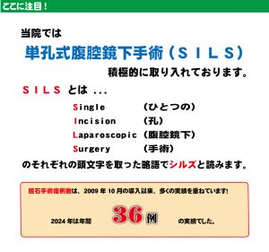 ここ近年、手術件数は少し減っていますが、腹腔鏡下手術の約9割以上で単孔式腹腔鏡手術(SILS)が取り入れられております。当院では患者様の体への負担が比較的に少ない腹腔鏡手術を積極的に行っております。