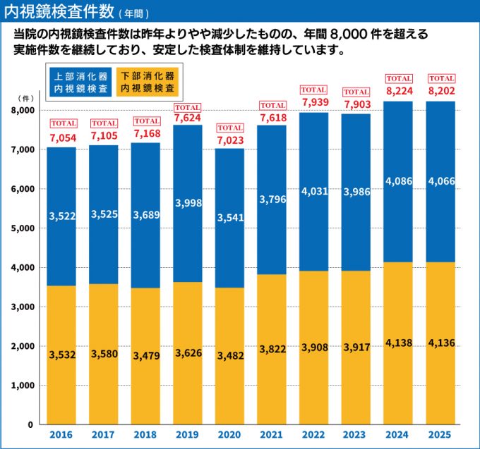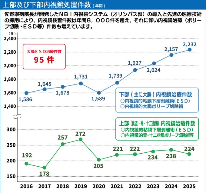 佐野寧病院長が開発したNBI内視鏡システム(オリンパス製)の導入と先進の医療技術の採用により、内視鏡検査件数は8,000件を超え、それに伴い内視鏡治療(ポリープ切除・ESD等)件数も増えています。