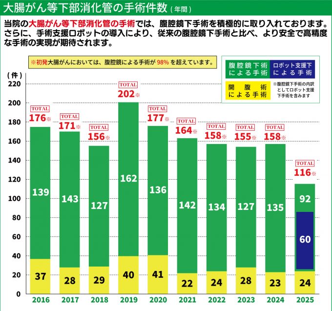 当院の大腸がん等下部消化管の手術では、腹腔鏡下手術を積極的に取り入れております。さらに、手術支援ロボットの導入により、従来の腹腔鏡下手術と比べ、より安心で的確な手術の実現が期待されます。
