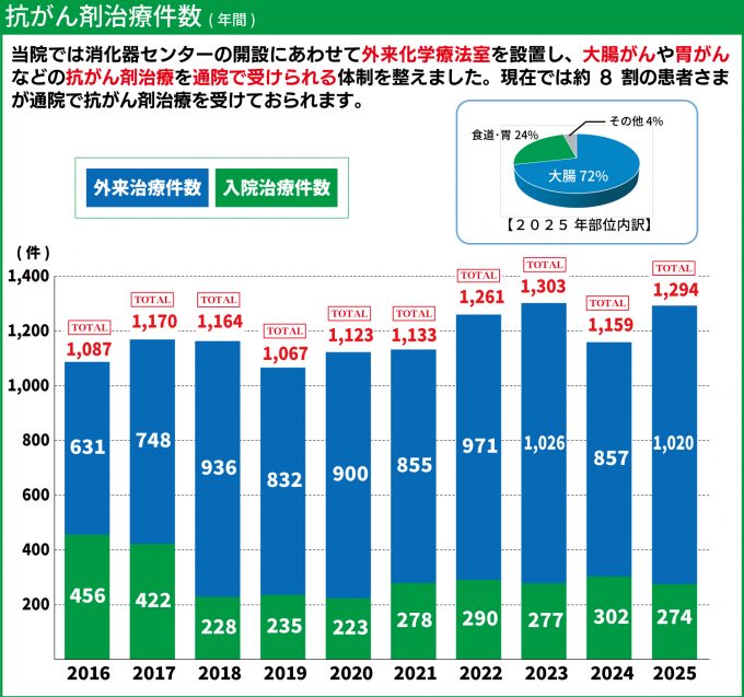 当院では、消化器センターの開設とあわせて外来化学療法室を設置し、大腸がんや胃がんなどの抗がん剤治療を通院で受けられる体制を整えました。現在では約8割の患者さまが通院で抗がん剤治療を受けておられます。