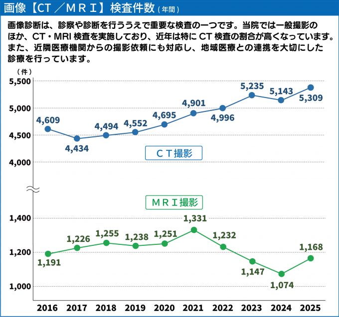 画像診断は診察や診断を行ううえで重要な検査の一つです。当院では、一般撮影のほか、CT・MRI検査を実施しており、近年は特にCT検査の割合が高くなっています。また、近隣医療機関からの撮影依頼にも対応し、地域医療との連携を大切にした診療を行っています。