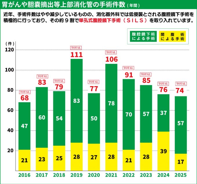 近年、手術件数はやや減少しているものの、消化器外科では低侵襲とされる腹腔鏡下手術を積極的に行っており、その約9割で単孔式腹腔鏡手術(SILS)が取り入れています。
