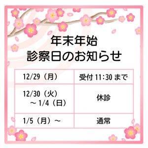 【お知らせ】 年末年始 休診日のお知らせ 2025年11月26日 【年末年始 休診日のお知らせ】 年末年始は下記の期間休診致します。 ご迷惑おかけ致しますが、何卒、ご了承下さい。 休診日:令和7年12月30日(火)から 令和8年1月4日(日)まで 令和8年1月5日(月)から通常通り診療いたします。