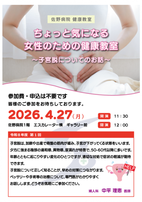 【お知らせ】 4月27日に健康教室を開催します(参加無料) 2026年04月20日 2026年4月27日に健康教室を開催いたします(参加費・申込不要) 2026年4月27日(月)11:30から1階エスカレーター横 ギャラリー前にて健康教室を開催いたします。 今回のテーマは「ちょっと気になる女性のための健康教室」~子宮脱についてのお話し~です。 参加費・事前申込みは不要ですので、ふるってご参加ください。